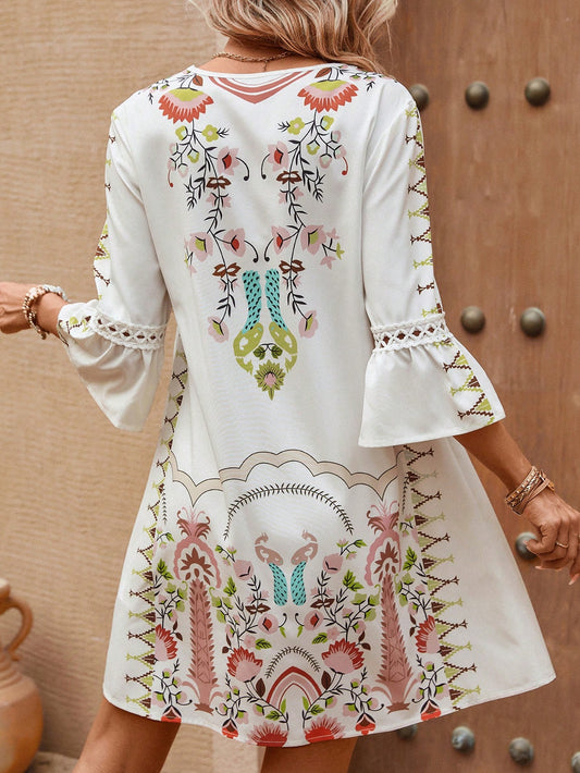 Floral Print V Neck Flounce Sleeve Smock Dress